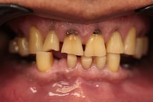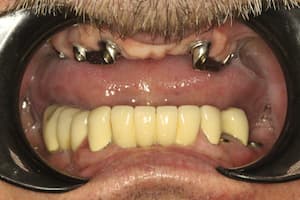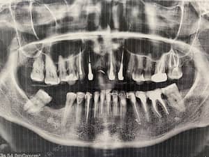 Диагноз: Отсутствуют 4 нижних передних зуба. Лечение: Установка 2х имплантов с последующим протезированием 4х зубов.