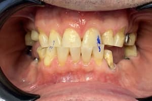 Виражений бруксизм, стирання зубів після гнатологічного обстеження лікар вирішив завищувати прикус до 2 мм і фіксацію центрального співвідношення. Встановлено коронки E.max на свої зуби. Коронки на імплантах виготовлені з металокераміки для запобігання сколам.